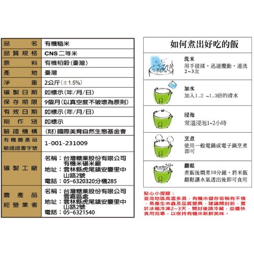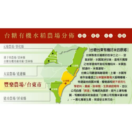 台糖有機米已通過財團法人慈心有機農業發展基金會(TOAF)及 國際美育基金會(MOA)有機驗證,並取得國家CAS有機驗證標章, 「台糖有機米」嚴選隔離帶佳之自有農地生產,完全無污染,土、水質、環境亦經過嚴格的檢測 ,所生產產品更通過農藥毒物試驗 所氣相層析儀、液相層析儀及可見光譜儀等精密儀器檢測分析無有害藥劑。 台糖有機米採每包2公斤真空平面包裝,自用送禮兩相宜。